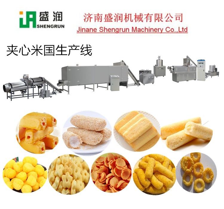 该生产线是我公司在吸收国外同类设备先进技术的基础上,自行研发的新一代膨化食品生产设备,其技术性能和产品质量均达到国外同类设备的先进水平,生产线从配料,挤压,膨化,成型,夹心,切断,喷涂到成品一次完成,完全实现自动化。该生产线具有机型多,设备配置灵活,原料范围广泛,产品种类繁多,操作简单等特点。通过变换模具和生产工艺,可以生产夹心饼,膨化米果、麦烧、营养早餐、锅巴等食品,适用于各种食品厂家。