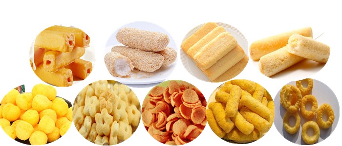 拌粉机→螺旋上料机→双螺杆膨化机→整形切断机(夹芯机)→提升机→多层连续烤箱→喷油/喷糖机→滚筒调味线→冷却机→包装机